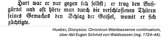 Unter der Überschrift „Kochen wie die Zisterzienser“ wird anschließend ein Rezeptteil präsentiert, entnommen dem „Koch-Buch So wol Für geistliche als auch Weltliche grosse und geringe Haußhaltungen“, verfasst von Bernardin Buchinger OCist (1606–73; im angezeigten Band irrtümlich jeweils „Bernhard“), Abt im elsässischen Lützel. Man kann so seine „Krebs-Knöpflin“, „Manus Christi Täffelin“, sein „Hirschen Wildprät“ und anderes am eigenen Herd nachkochen.